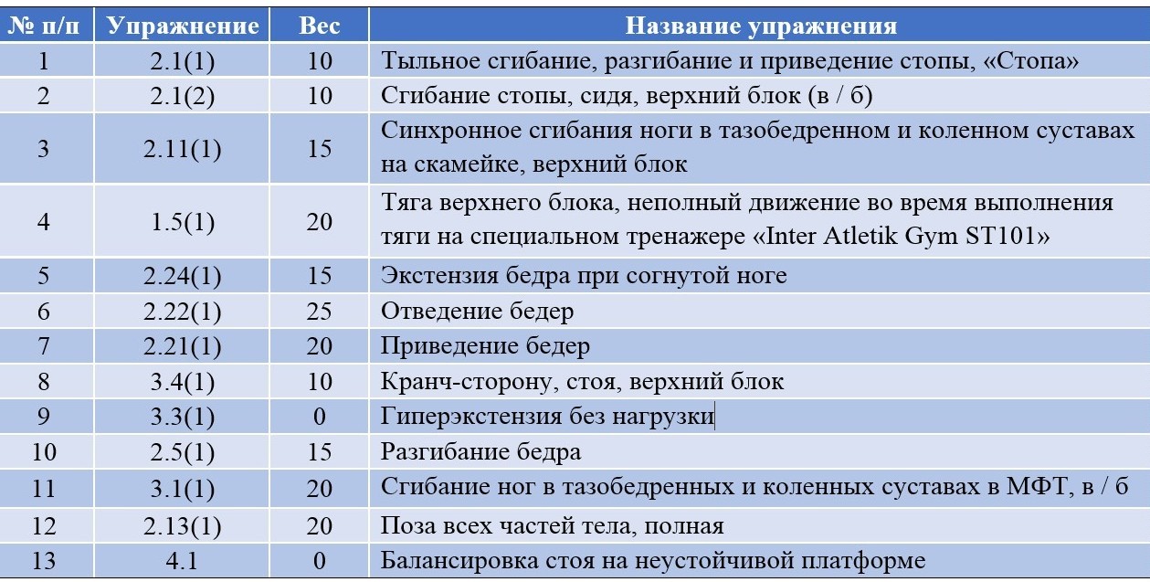 Так, для усиления большой ягодичной мышцы была включена упражнение 2.24 «Экстензия бедра» - тяга с нижнего блока ногой, которая выполняется на декомпрессионной многофункциональном тренажере (БФТ) «Блочная рама Inter Atletik Gym ST103».